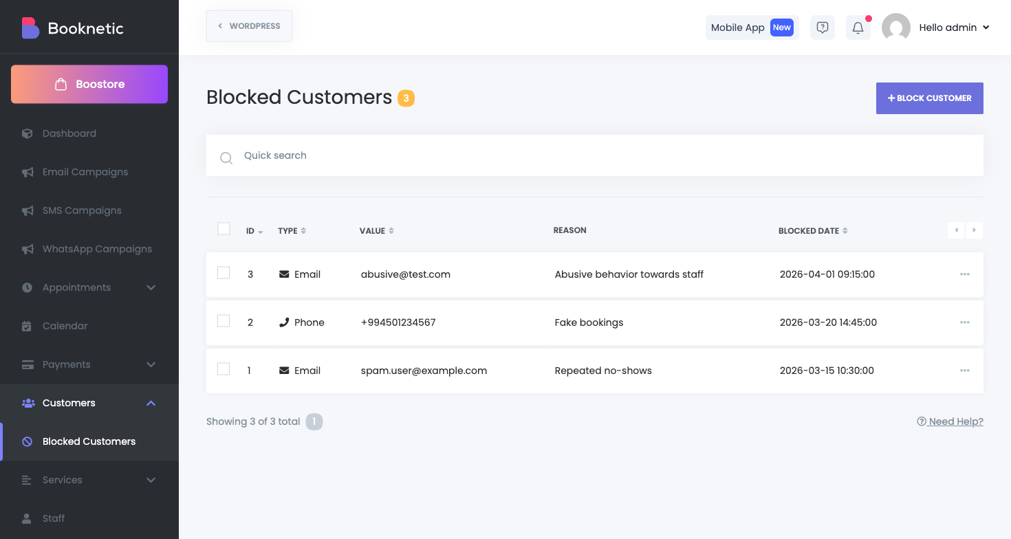 Blockierte Kunden gibt Ihrem Team eine direkte Möglichkeit, unerwünschte Buchungen von bestimmten Kontakten zu stoppen.