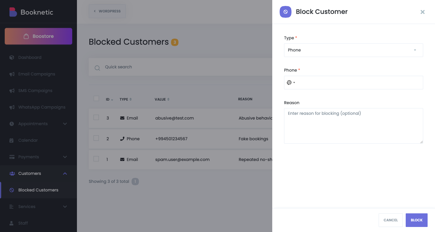 Block customers by email or phone and stop new frontend bookings from restricted contacts while keeping full admin-side control.