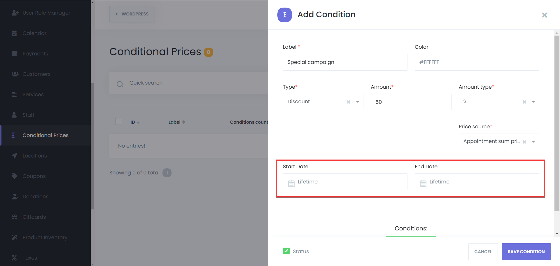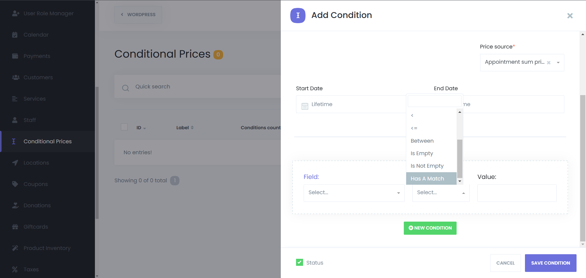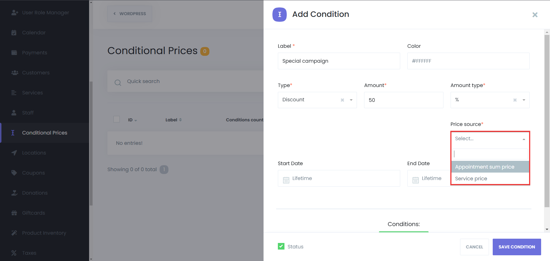 - Service Extra: Set conditions for additional services or extras (e.g., discounted prices when a specific add-on is selected).