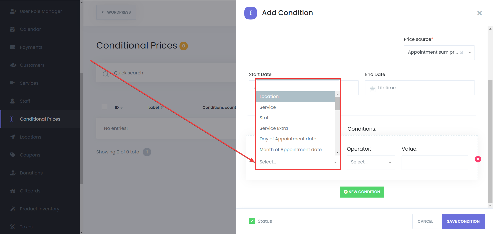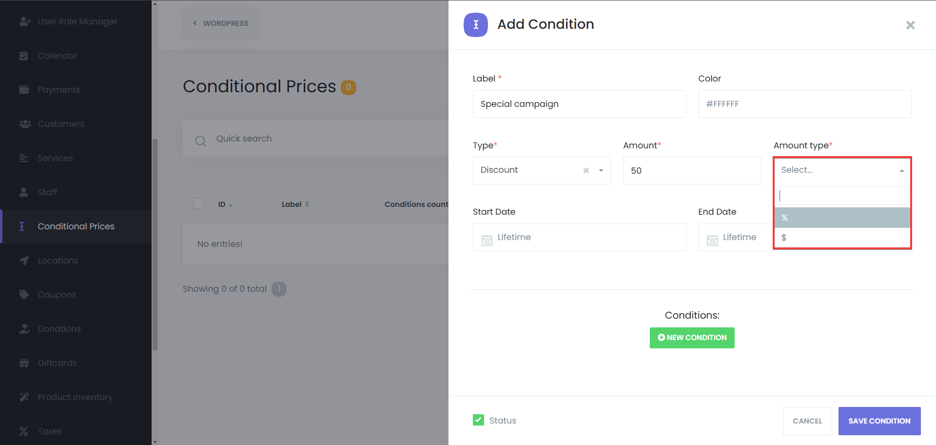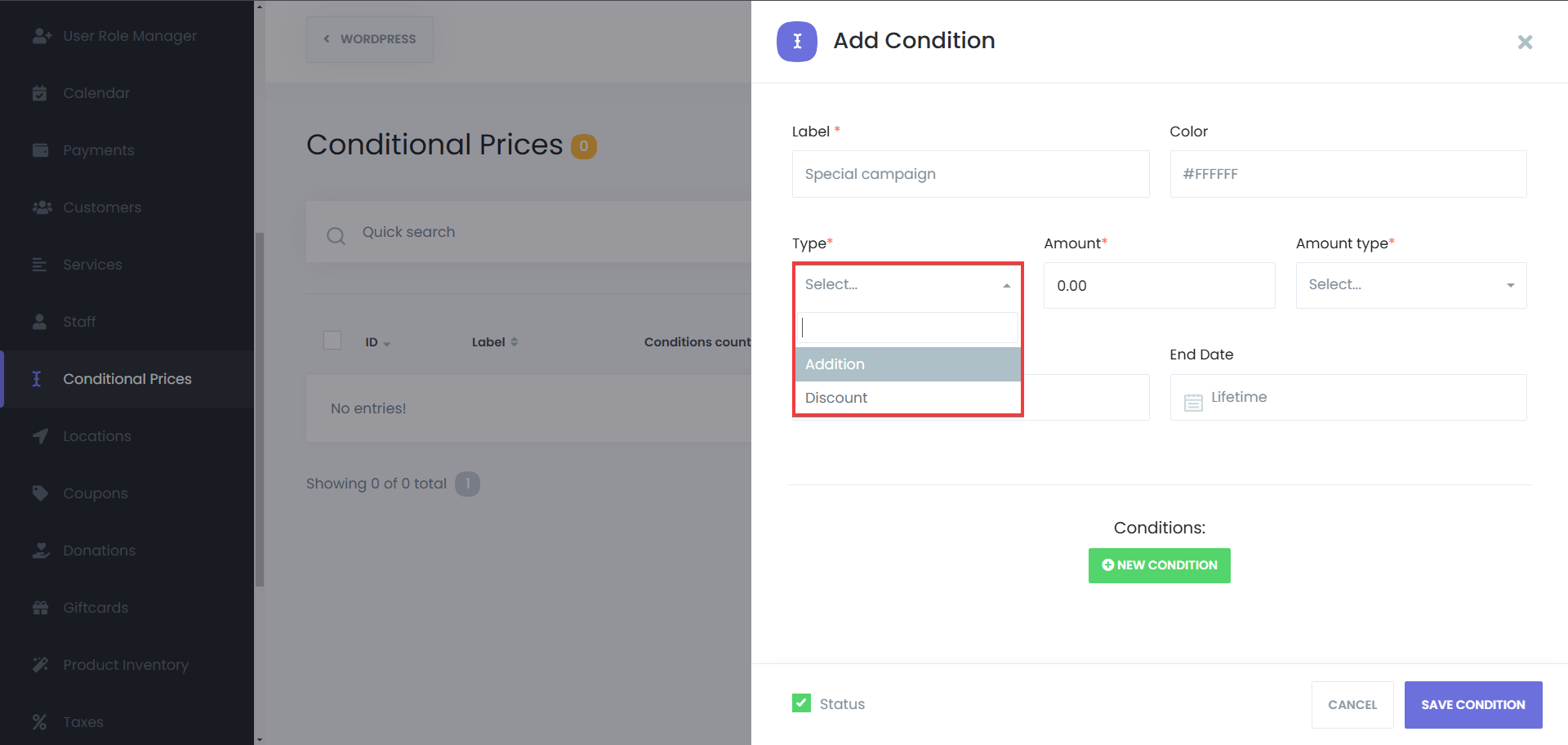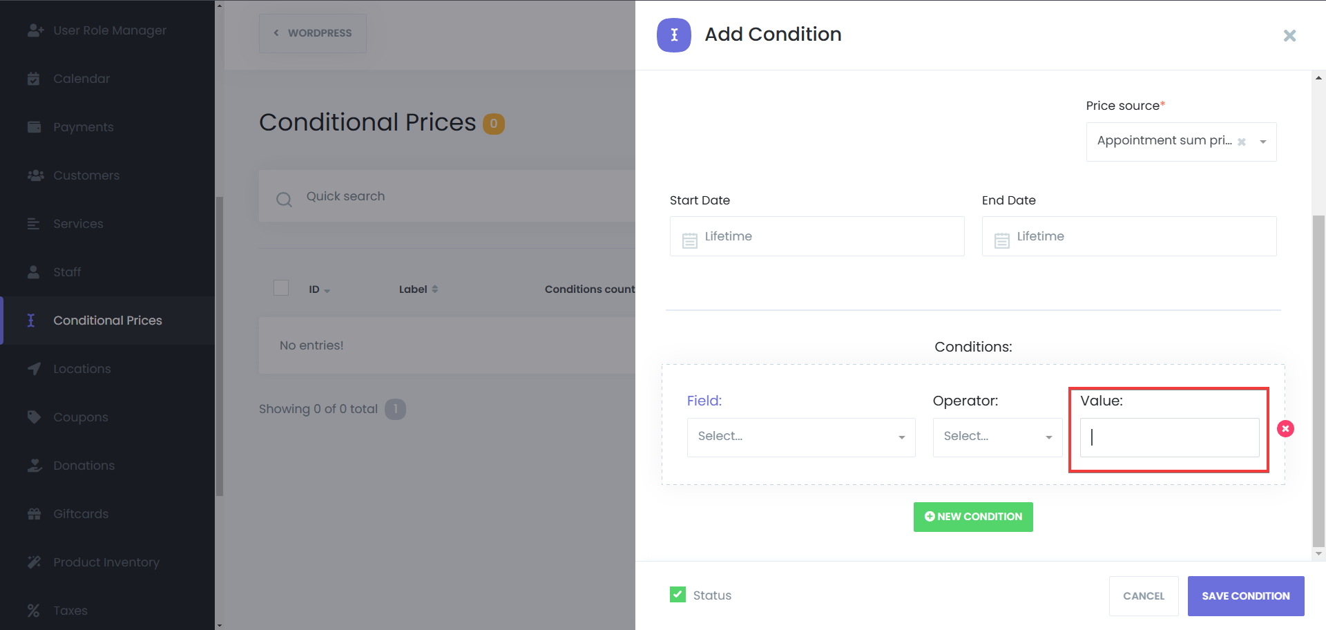 - Set the value of the condition, keep in mind that the addition/discount you set earlier will work based on the condition value that you set.