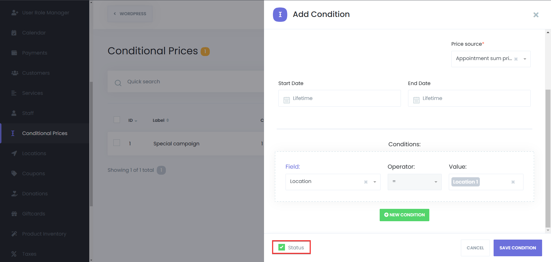 - Enable or disable the condition by clicking on the status checkbox on the bottom left corner of the panel. If the box is checked, then the condition will be set as “Active”: