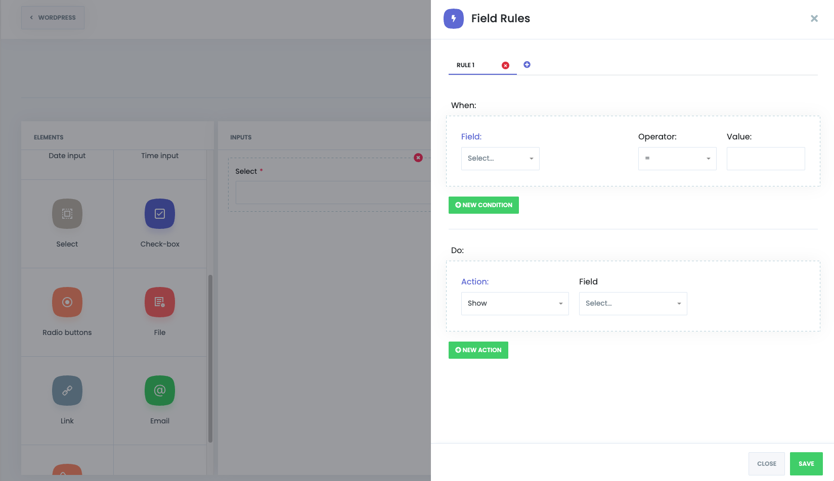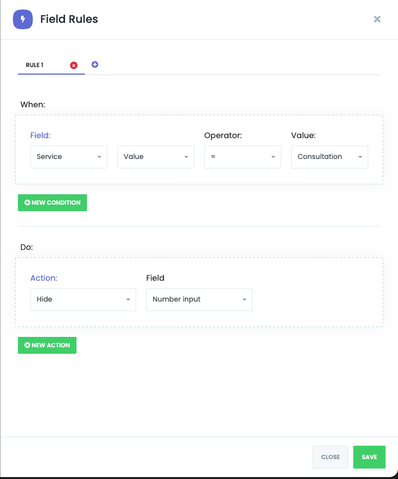 The Field Conditions feature allows you to create conditional logic for your customer fields. This enables dynamic form behavior where fields are shown, hidden, or have their values modified based on customer selections.