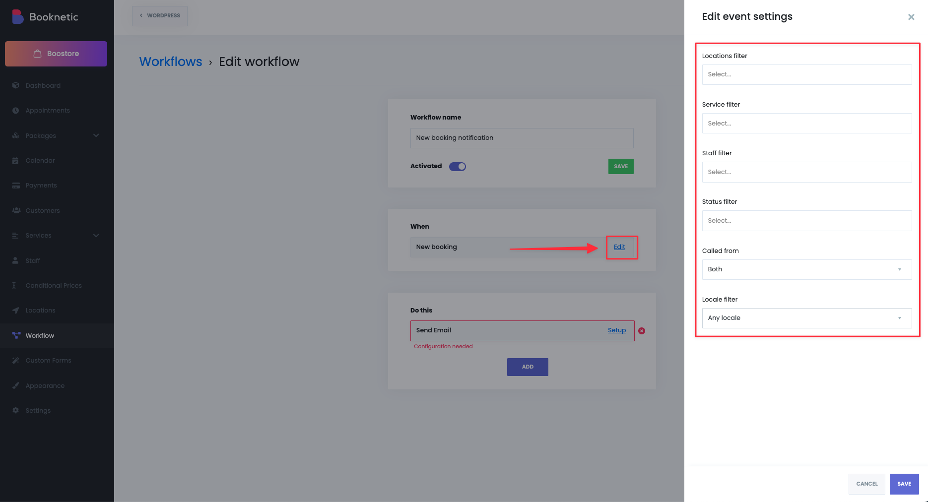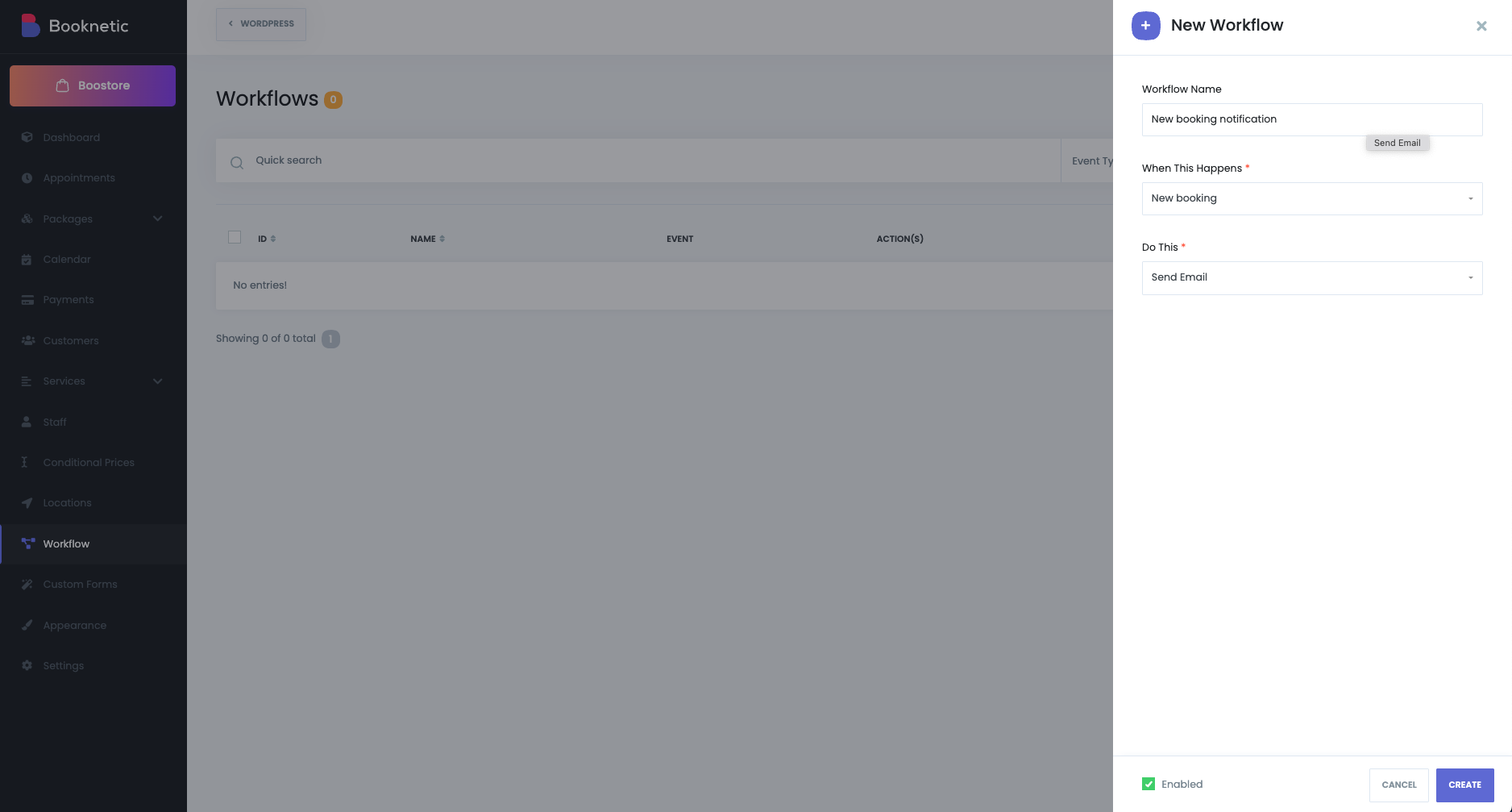 Choose how the notification will be sent. Booknetic supports multiple email actions inside workflows: