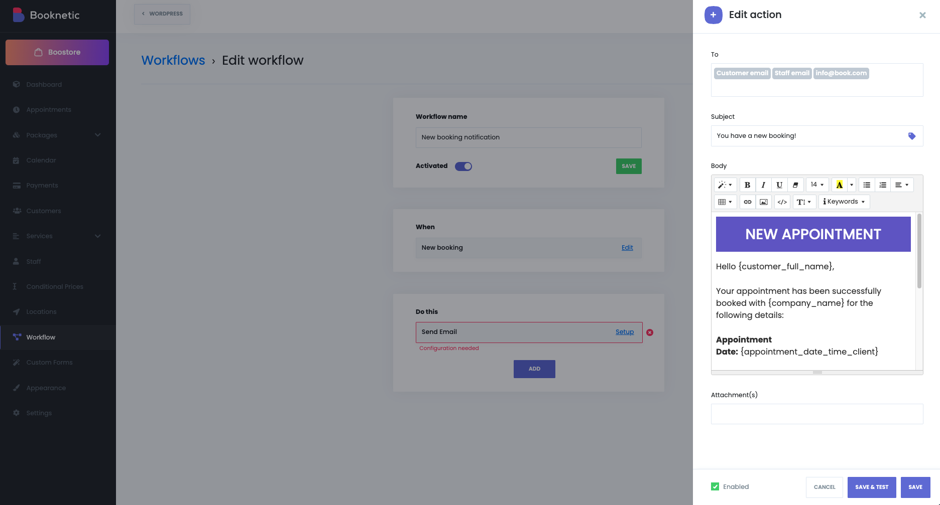 Email notifications are an essential way to keep customers, staff, and admins updated about bookings. Booknetic provides a powerful notification system that works hand in hand with the Workflows Module, so you can automate confirmations, reminders, cancellations, follow-ups, and more.