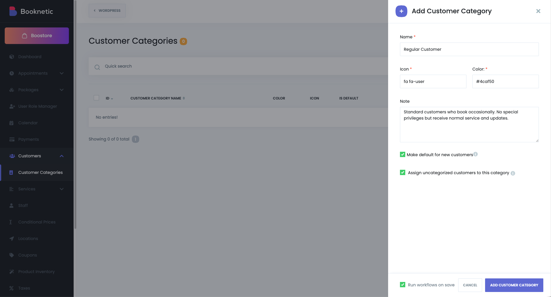 The Customer Category feature is fully integrated with Booknetic’s Workflow Automations.